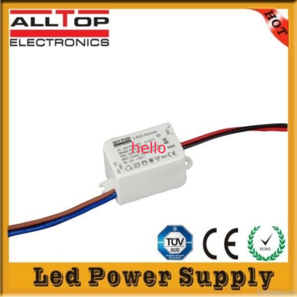 Constant Current LED Power SupplyWe make custom production. Just share your required specs, we will provide estimates. 1,Constant Current 2,high luminous efficiency 3,CE approval led driver 4,high quality and competitive price LED power supply: Product Specitications Product Model AT3W250-07 Input Voltage 175~264VAC 50/60HZ Output Voltage 12V DC Constant Output Current 250mA 5% Conversion Efficiency ?88% Rated Loading 3W Safety Protection Short cricuit, Open circuit, Over load Protection Outline Dimension L*W*H(mm) 40×28×22mm Operation Env.Temp.Ta -20~+50°C Raise Temperature ?30°C Storage Temperature -30~+75°C Approval CE,EMC,TUV , Mechanical figure: Quality Approval: We aslo provide other various types of drivers and swithing power supply as you need . For more information, please let us know.